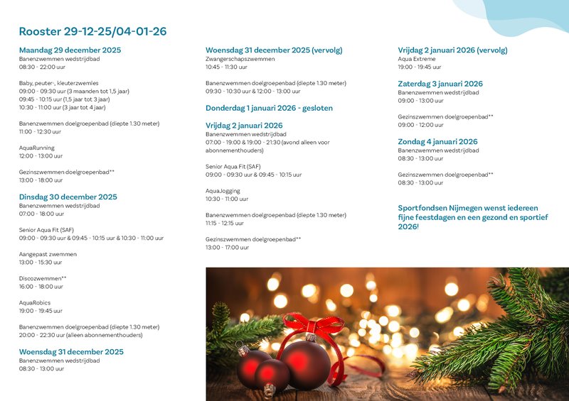 Kom jij ook gezellig zwemmen in de Kerstvakantie? ๐ Van zaterdag 20 december 2025 t/m zondag 4 januari 2026 (week 52 en week1) zijn er aangepaste roosters in alle zwembaden van Sportfondsen Nijmegen.